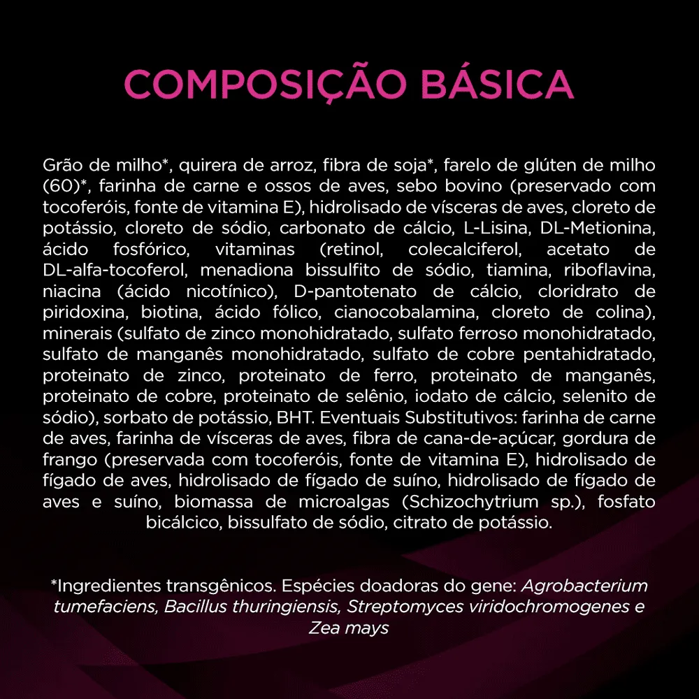 Composição básica: grão de milho*, quirera de arroz, fibra de soja*, farelo de glúten de milho (60)*, farinha de carne e ossos de aves, sebo bovino (preservado com tocoferóis, fonte de vitamina E), hidrolisado de vísceras de aves, cloreto de potássio, cloreto de sódio, carbonato de cálcio, L-Lisina, DLMetionina, ácido fosfórico, vitaminas (retinol, colecalciferol, acetato de DL-alfa-tocoferol, menadiona bissulfito de sódio, tiamina, riboflavina, niacina (ácido nicotínico), D-pantotenato de cálcio, cloridrato de